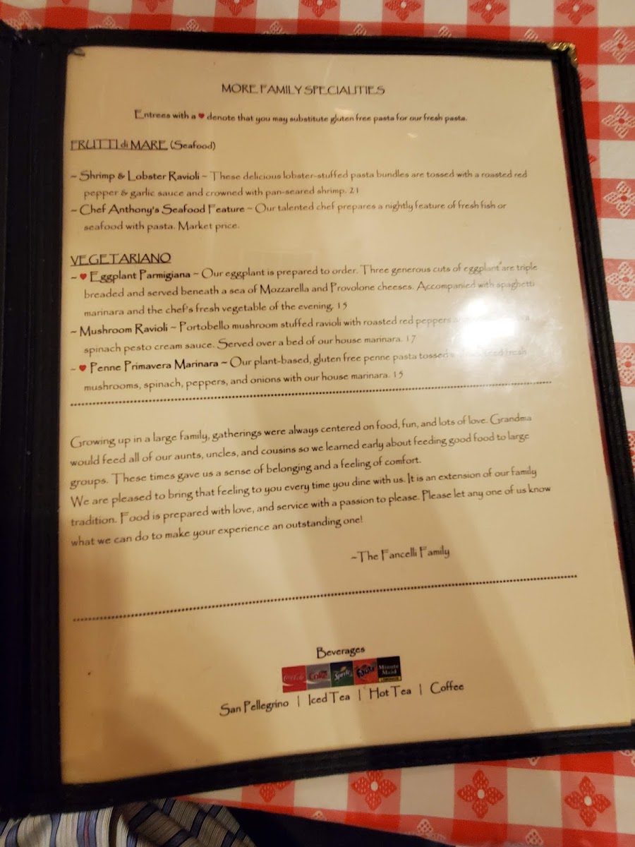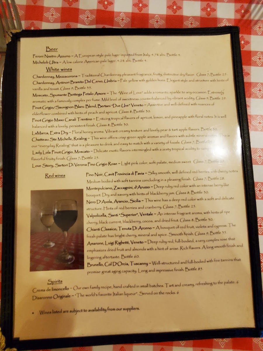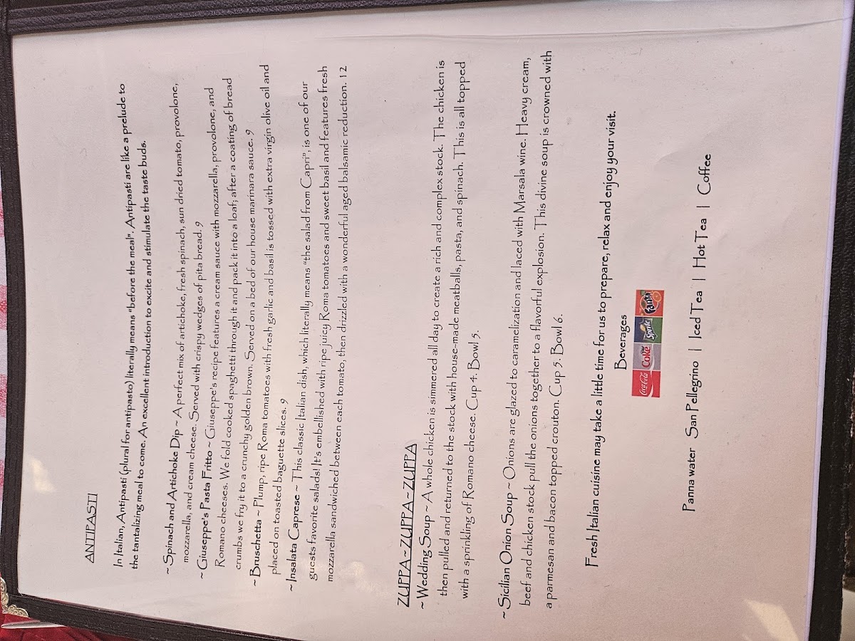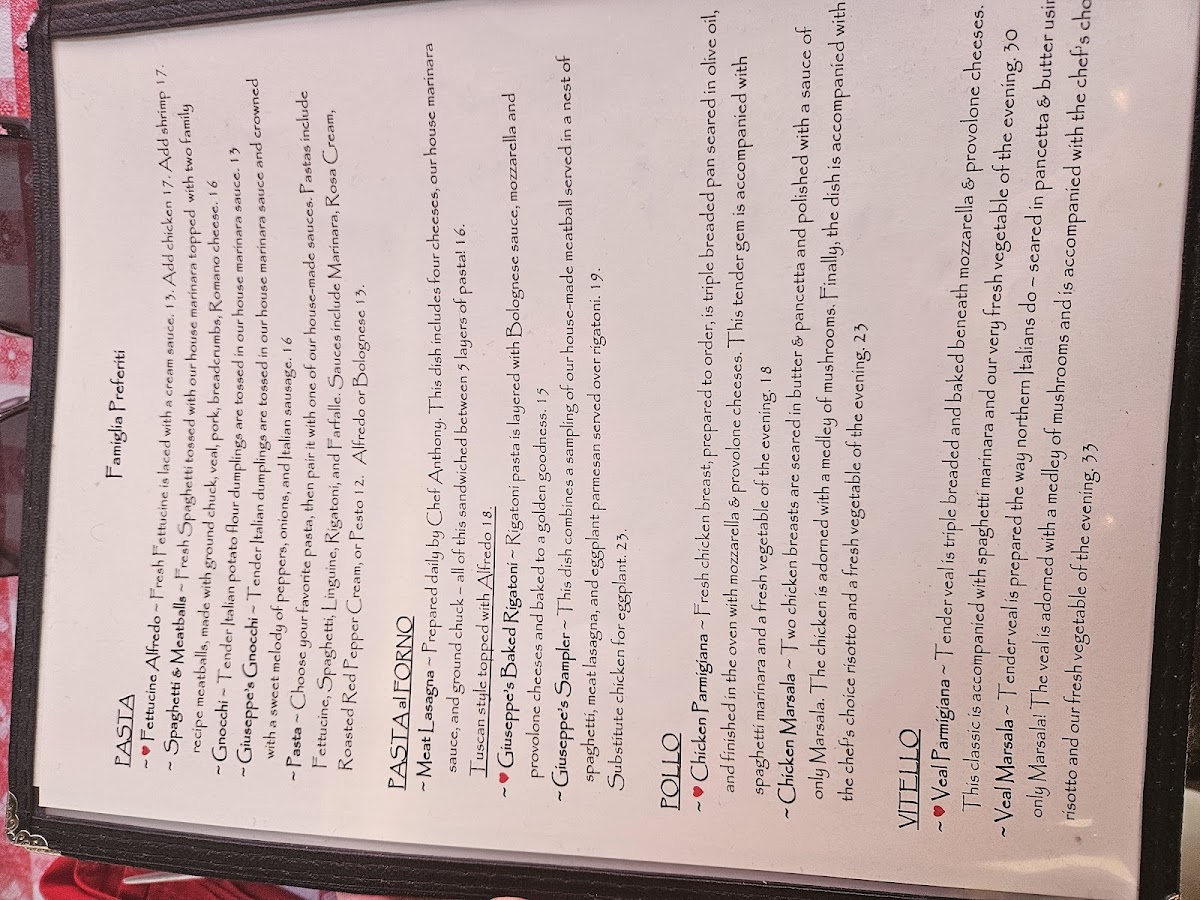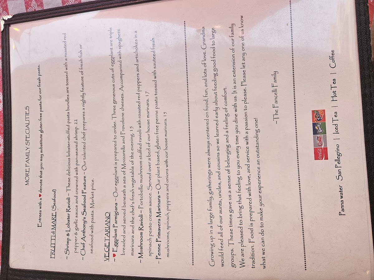 Guests can enjoy a range of options from hearty soups like Sicilian Onion and Italian Wedding, to freshly baked breads and light appetizers such as Bruschetta and Insalata Caprese. Entrées highlight timeless favorites like Veal Parmigiana, Chicken Marsala with Risotto, and Shrimp & Lobster Ravioli, all designed to pair beautifully with carefully chosen Italian wines or a glass of bright Prosecco.